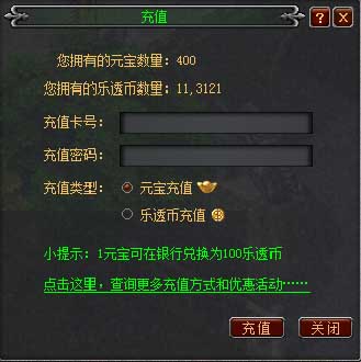B、在弹出的窗口中,输入充值卡号及密码,点击“充值”按钮即可。(小提示:如果充值类型选择“元宝充值”,在游戏中可以通过银行职员,把元宝兑换成乐透币)
